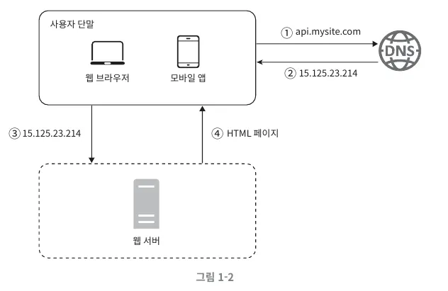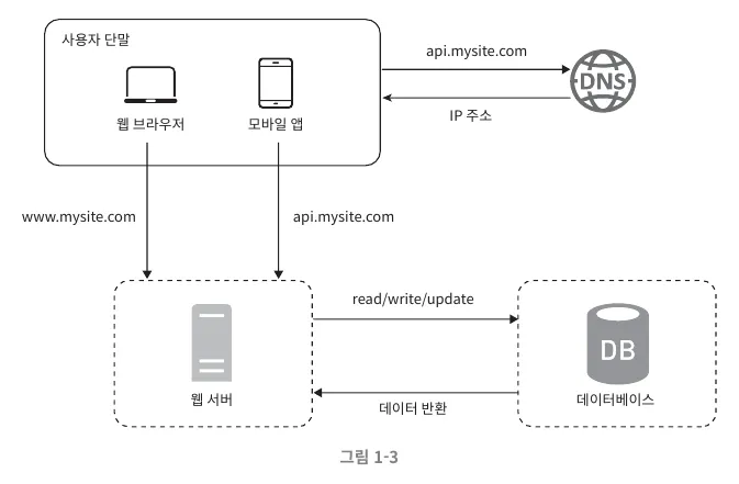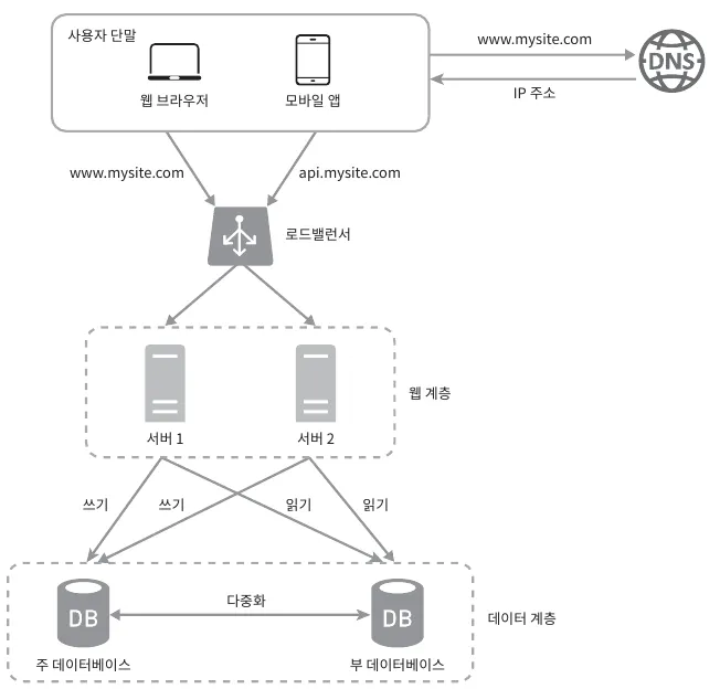 단일서버에서 더 많은 트래픽을 감당하기 위해 생각해 볼 수 있는 것은 웹/모바일 트래픽 처리 용도 서버 1개, 데이터베이스 서버 1개를 독립적으로 운용하는 것이다.