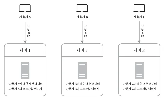 마찬가지로 사용자 B, 사용자 C도 자신의 상태정보가 저장되어있는 서버로만 요청이 전송되어야 인증에 성공할 것이다.