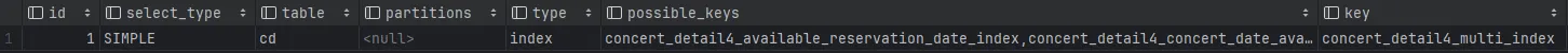Index : concert_id, concert_date, available_reservation_date (단일인덱스)