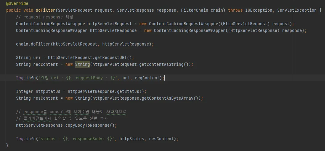 ContentCachingResponseWrapper 는 응답 본문을 캐시로 읽어들인 후,