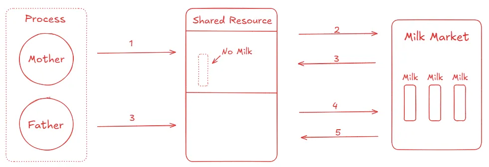 우유가 한개가 필요한 상황인데 프로세스(엄마, 아빠)간에 동기화가 되지 않아 엄마가 우유를 사러 간 것을 모르는 아빠가 우유를 사와